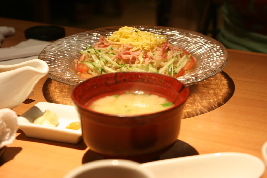 其實我沒有想到我會在香港吃日本料理,而且是在吃完早餐不久緊接著。味十味是在時代廣場附近一棟大樓裡6樓的一家日本料理餐廳,菜單是毛筆字的日文,由於天氣熱所以我和鵝小姐都點冷麵,一早就起來工作的Rey先生點的則是牛尾飯。