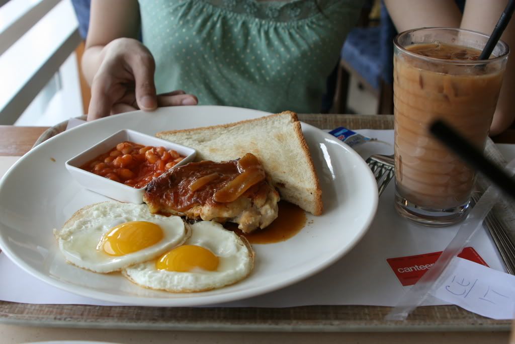 這幾天凍奶茶喝了好幾杯,不知道是因為心情的關係,我覺得這裡的凍奶茶是最好喝的,茶味香而不澀,冰塊的份量剛好,相當透心涼。餐肉我是與牛油方包一起合著吃掉的,如果不這樣做,我深怕過鹹的餐肉在沒有麵包的包覆之下,在我的腎臟鑿了起千個小洞,在大舉來犯我的腸胃之後。