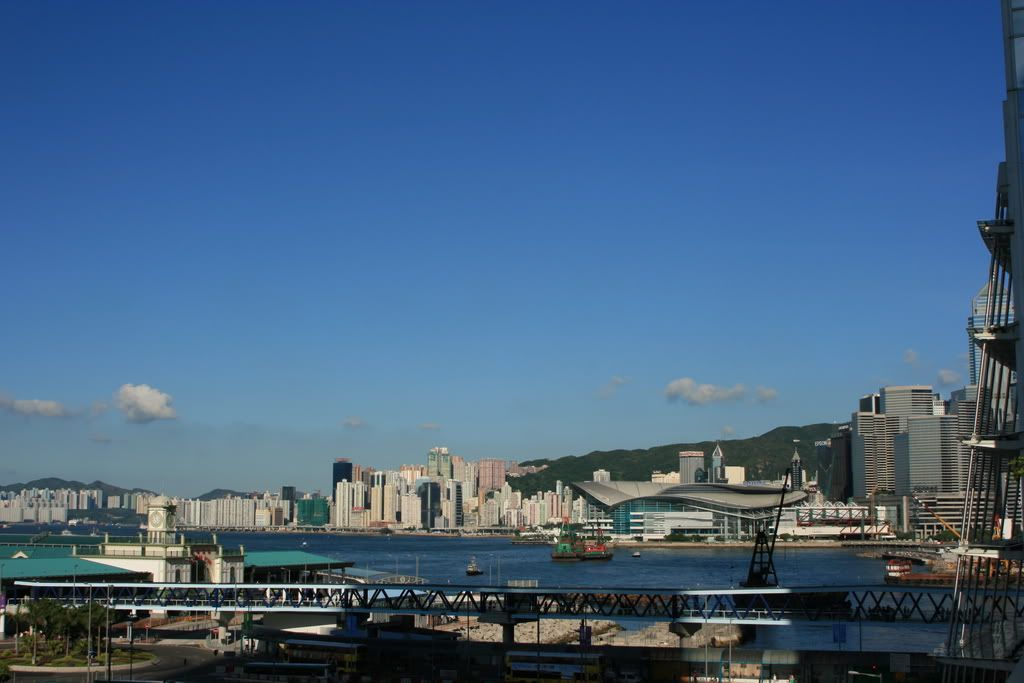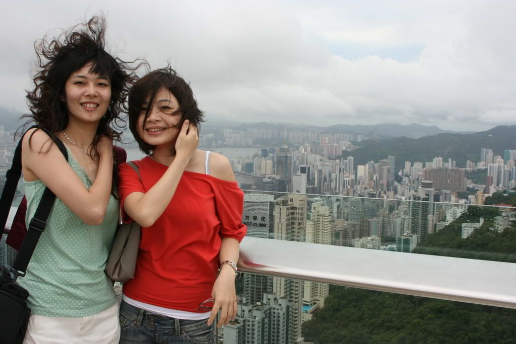 我們在凌霄閣的觀景台照了幾張相,由於沒有了Rey先生,所以只好請人幫我們合照,不過單眼相機在手,而且天氣又不好,我決定要挑個也拿單眼而且看起來很專業的人幫我們照。命運就是這樣,在你設定好目標條件之後,剛剛拿單眼的人瞬間通通跑光光,只剩下哪種照相會紮馬步的老實爸爸;拿很貴族價位的數位相機但是沒什麼功用的年輕女生;或者是一臉橫肉的疑似巴基斯坦人,躊躇了老半天,最後終於被我看到一位拿單眼還加遮光罩的外國男子,好,就是他了!別誤會我真的沒有要撘訕他的意思,純粹是希望在香港的最後這短短幾小時,能留下紀念。老外真不錯,幫我們照了兩張照片,可能是因為風大怕失敗的機率高吧。感謝這位也在香港的異鄉人。