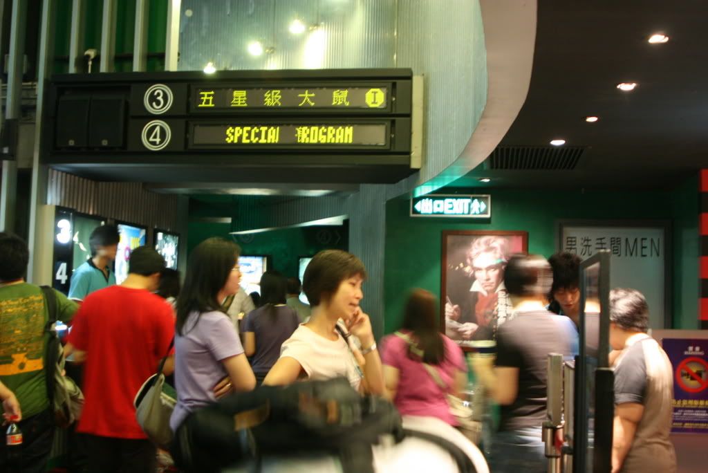 電影院的規模類似台灣專門播放非主流或藝術電影的台北真善美、學者影城,小小的不是很大,不過那場電影是客滿的,即使我們網路訂票還是坐在第三排,不過他的大螢幕是在稍為必需仰頭看的視角位置,所以椅子也設計了能夠往後躺的空間彈性,因此即使坐在前排,也不至於不舒服,最後有點像半躺在椅子上看電影。喜劇片果然是比較不受限於語言和文化的電影類型,廣東話系統的繁體字幕偶爾反應不過來,不過娛樂的程度似乎沒有因此大受影響,只是開場前的普通話聊天方式,偶爾會感受到前排與左右的觀眾不習慣所產生的轉頭與回頭反應。