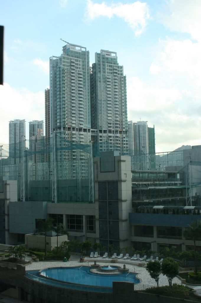 由於窗戶都是大片大片的,除了浴室與餐廳面對位置的關係,通風較差之外,其他的地方視野都很好。從客廳的往外看,有佔地廣大的游泳池、遮住天空很多的水泥大竹筍,以及微微的藍天。推出去的窗戶設計更有感覺,好像一瞬間就可以碰觸到外面的風景與世界。這裡有三個出口,第一個在商場後面可坐電梯直達住家;另一個從住宅的側門出去,外面是大樓的大堂庭院,另一邊可以直通游泳池,我們早上出入幾乎都從這個出口,就像這裡的居民一樣,跟著要上班的人群從自己的住家匆匆行至大門,不過我們是要出去玩,在大家都得上班的日子裡。另一個出口是我們晚上回來的入口,也就是住宅區大樓正門,有管理員伯伯的地方。香港的大樓以"座"為計量單位,我們在八座。