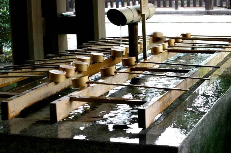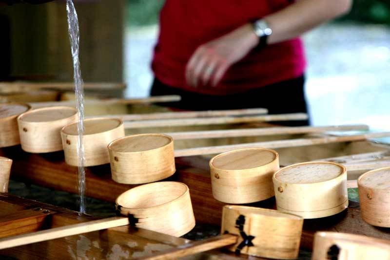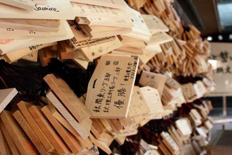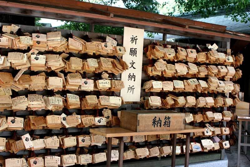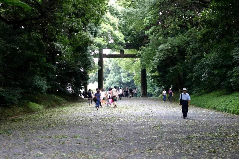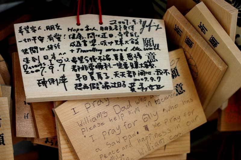 前往明治神宮的路上是以碎石子當作路的材料,因此走起來相當的不高興,在加上由於前晚濕腳的經驗,穿著涼鞋踏在碎石路上的我,幾乎是靠著意志力走完全程,不,還有出去的同樣路程。為了轉移注意力,我們只好沿路不停地假笑拍照,每當有人拿起相機時大夥原本黑了半邊的茅坑臉,又可以突然的像中樂透一樣的露出極度燦爛的笑臉,在喀嚓聲後,又恢復原本的臭臉與看起來運氣很不好的苦瓜嘴。接近明治神宮時,左右兩側各會有一排擺放整齊的酒桶,右邊彩色的是釀造葡萄酒的酒桶,而左邊較為呆版平時的木頭酒桶是用來裝日本清酒的,觀光客到此都不自覺的會拿出相機拍照。要進入明治神宮前,左側會有向淺草寺一樣的神水區,放著十幾個勺子供遊客洗手與喝水。明治神宮雖然必須耗費一點體力,但是基本上是相當值得的,至少我們在這邊的御守前就貢獻了將近三千塊台幣,尤其以永如小姐的一千兩百塊最為大宗。我以為會有很多人在此寫祈願牌,沒想到前前後後我只看到我們三個人寫,而且是很窮酸的三個人硬擠在一塊祈願牌上。不過窮酸歸窮酸,我們又再度了做了一件符合經濟實惠的自助旅行原則的事項。許願的事蹟不外乎是希望賺大錢、家人朋友都平安、往後一切事事順心等諸如此類的願望,雖然很平凡也很普通,但是是真心的這樣希望。祈願牌的地方其實很小,依照日本每年龐大的觀光人次,我想沒多久這個祈願亭就要牌滿為患了,在兩位小姐寫願望的同時,我突然有個疑問,所有的旅客的祈願牌完全都在此地嗎?太多了怎麼辦?他們要怎麼處置這些東西呢?發放給山區需要燒柴火的居民嗎?或者再度販賣給造紙廠商從中酌收費用呢?還是專門有儲藏室安置這些過期且又發霉的祈願牌?