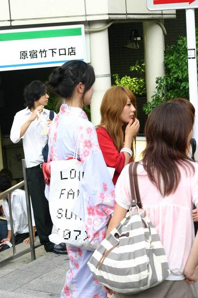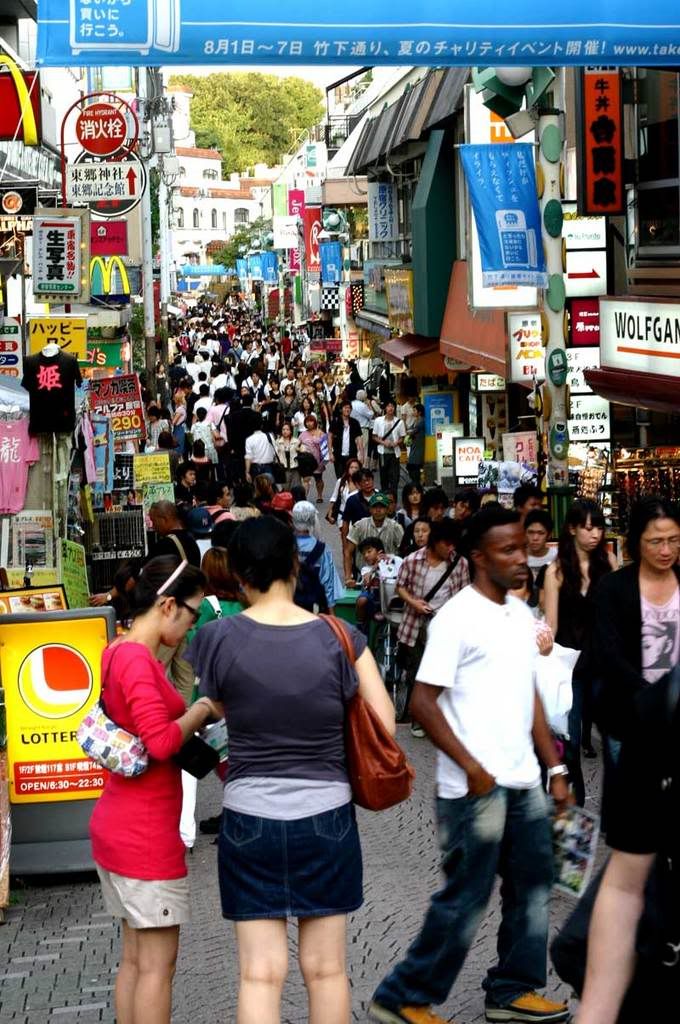 竹下通就在原宿車站前,也就在明治神宮旁,表參道也在這,逛累明治神宮的人可以晚上好好的在此地吃個晚餐,逛逛街,是個很不錯的方式。竹下通裡的主要客層以國高中生為主,這裡的年輕人每個都是1988年次之後,什麼樣的新潮古怪奇特裝扮,在這裡反而司空見慣。大家自然的談笑風生,還可以在厚厚的濃妝下認出自己的朋友。你可以在熱門的可麗餅攤前看到一群美少女戰士在啃著擠滿奶油的草莓可麗餅;在美少女戰士對面的可能是一群主張穿洞主義並且徹底執行的瘦巴巴營養不足年輕小夥子,大家正抽著煙並從穿著誇張鼻環的鼻子吐出煙來;而在逛藥妝店時,可能又可以看到一群小女生穿著公主裝,一面聊著天一面用澎澎的圓裙與頭上的皇冠完全地佔滿了上樓樓梯的寬度,若是碰巧在後面的你可能只看的見前方一片粉紅春天讓你暈頭轉向,階梯採了個空,又或者在硬是擠過他們時突然的被他們晃頭晃腦而在空中上下擺動的羽毛不偏不倚的打中你的臉龐。多麼有趣的一個地方,就像是身處在童話王國裡。只可惜我們的赤子之心早就遺忘在很遠的從前,老實說,竹下通還是適合年輕人的地方。而我們最後選擇實際的到藥妝店採買我們所該買的物品,結果就這樣提著該死的大包小包與千斤頂相機痛苦的前往六本木。